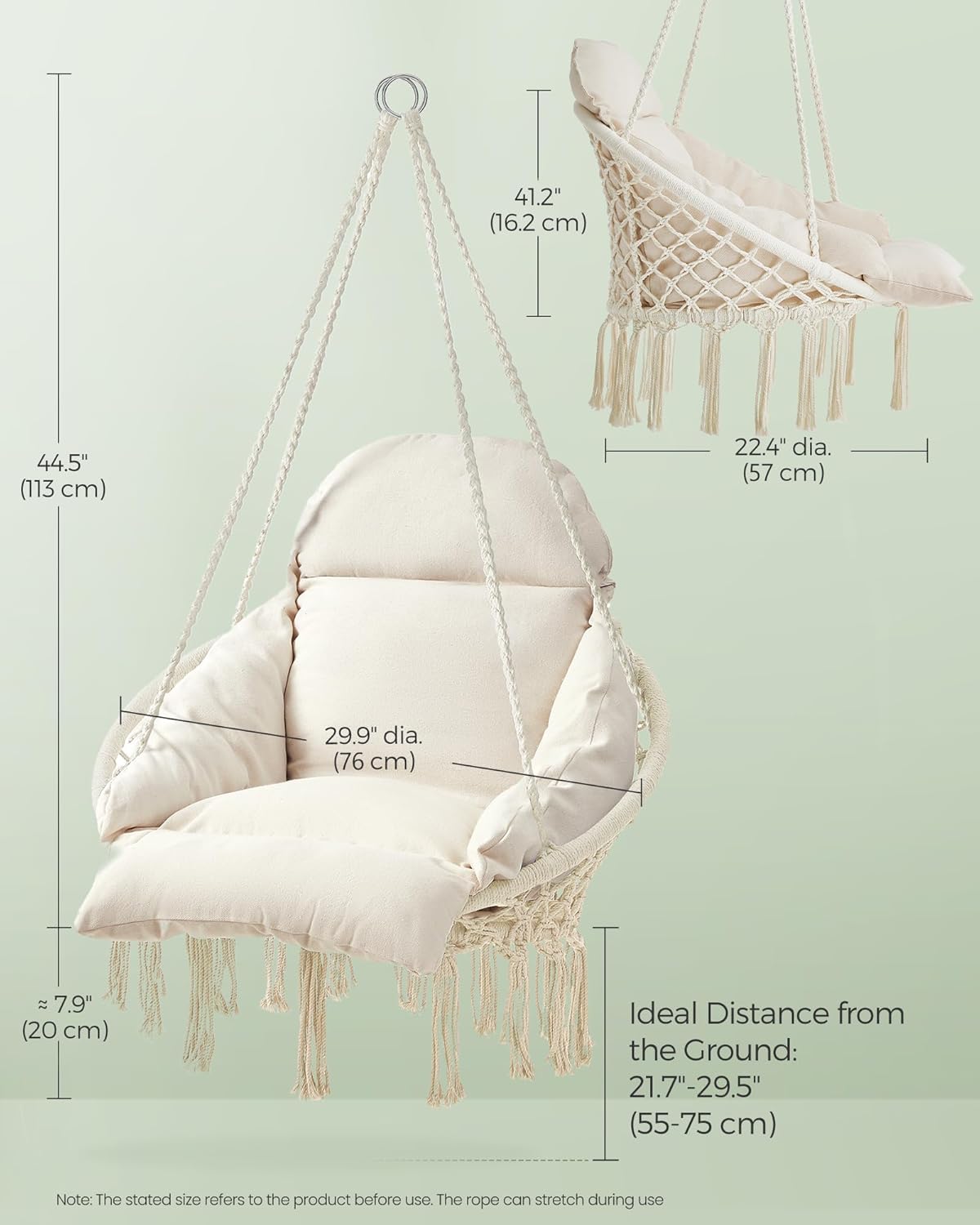 Transform your space into a cozy retreat with the SONGMICS Hanging Chair, a boho-style hammock chair featuring a large, plush cushion for all-around comfort. Its sturdy metal frame, double-reinforced seat, and high weight capacity of 264 lb ensure durability and lasting relaxation. Versatile hanging options and included accessories make setup simple, whether for your bedroom, patio, or garden. Elevate your home with both style and comfort—perfect for reading, meditating, or unwinding in chic elegance.