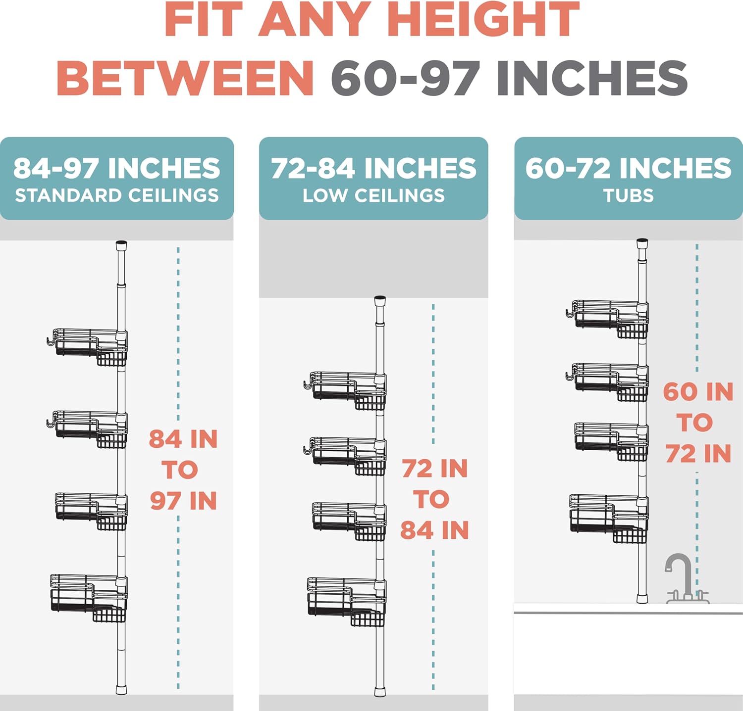 The Zenna Home Tension Pole Shower Caddy Corner Organizer is a must-have for maximizing your bathroom storage, featuring four spacious L-shaped baskets, adjustable shelves, and handy hooks for ultimate customization. This sturdy, rust-resistant organizer fits most tubs and showers (60 to 97 inches high) and boasts a new adhesive brace for added stability—no drilling or tools required. Its open-wire design ensures quick drying, and it can even be used beyond the bathroom for versatile storage. Upgrade your shower space with this durable, easy-to-install caddy from Zenna Home and keep your essentials neatly organized.